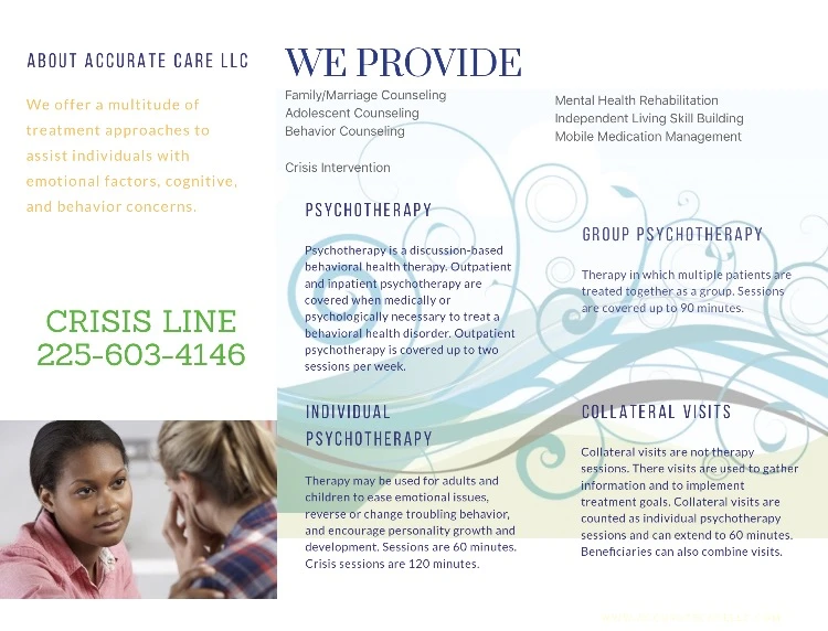 Accurate Care is an accredited substance abuse treatment center that provides outpatient treatment for men and women between 18 and 65+ years of age. As part of their special programs, Accurate Care treats clients with co-occurring mental and substance use disorders, veterans, and active duty military. To help patients achieve sobriety, Accurate Care provides intake assessments. Afterward, patients receive cognitive behavioral therapy, telemedicine/telehealth therapy, and substance use disorder counseling during treatment. Accurate Care is located in Baton Rouge, Louisiana, providing treatment for people in East Baton Rouge County, accepting cash or self-payment, medicaid, and medicare.